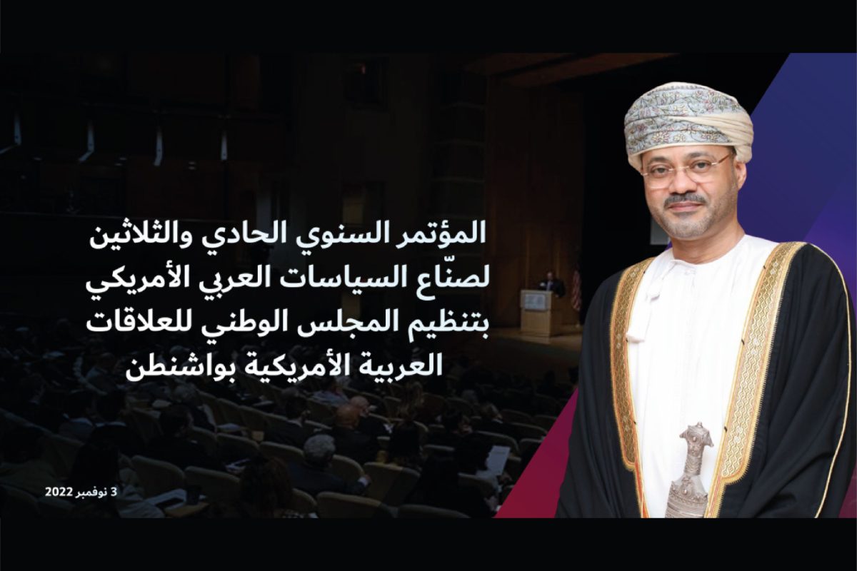 إيجاز للكلمة المسجلة لمعالي السيد بدر بن حمد بن حمود البوسعيدي وزير الخارجية في المؤتمر السنوي الحادي والثلاثين لصنّاع السياسات العربي الأمريكي والذي نظمه المجلس الوطني للعلاقات العربية الأمريكية في واشنطن بتاريخ 3 نوفمبر 2022.