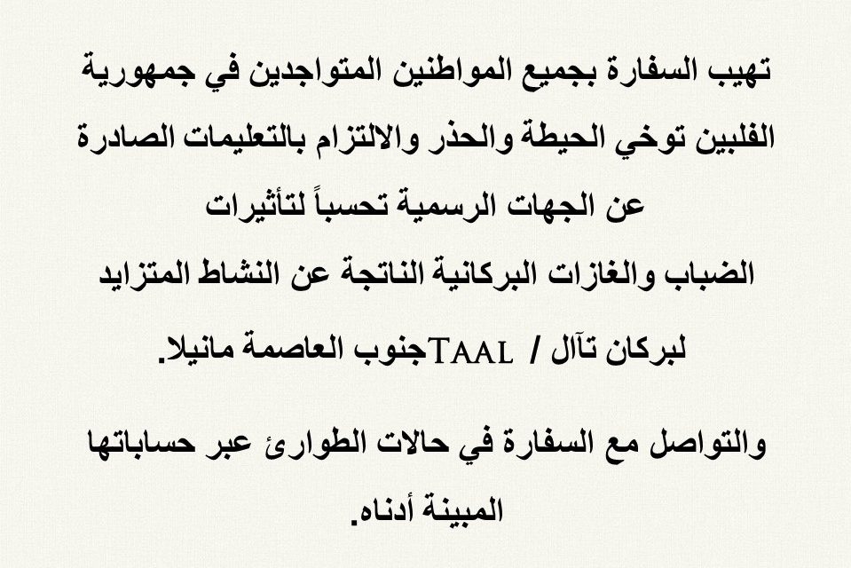 أصدرت سفارة سلطنة عمان بالفلبين تنبيها للمواطنين بضرورة أخذ الحيطة والحذر والالتزام بالتعليمات الصادرة عن الجهات الرسمية تحسباً لتأثيرات الضباب والغازات البركانية الناتجة عن النشاط المتزايد لبركان تعال (TAAL) جنوب العاصمة مانيلا.