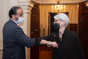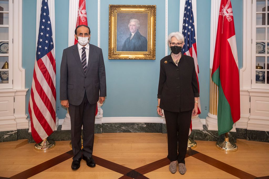 سعادة الشيخ خليفة بن علي بن عيسى الحارثي، وكيل وزارة الخارجية للشؤون الدبلوماسية، يجري مباحثات رسمية مع نظيرته سعادة ويندي شيرمان نائبة وزير الخارجية الأمريكي.