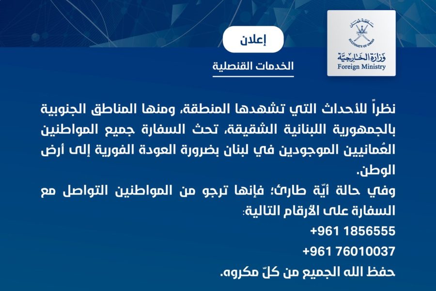 نظراً للأحداث التي تشهدها المنطقة، حثت سفارة سلطنة عُمان بالجمهورية اللبنانية الشقيقة جميع المواطنين العُمانيين الموجودين في لبنان بضرورة العودة الفورية إلى أرض الوطن.