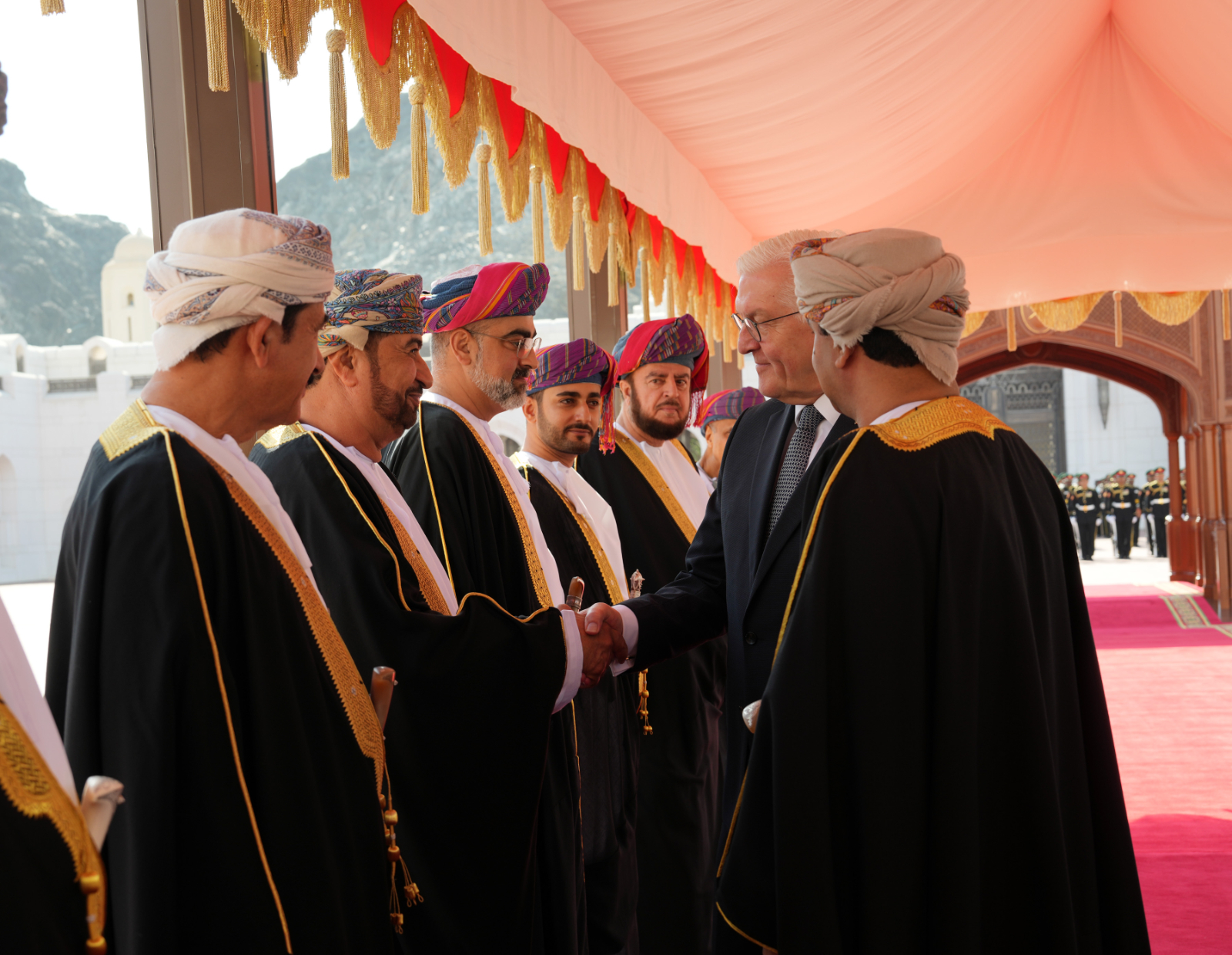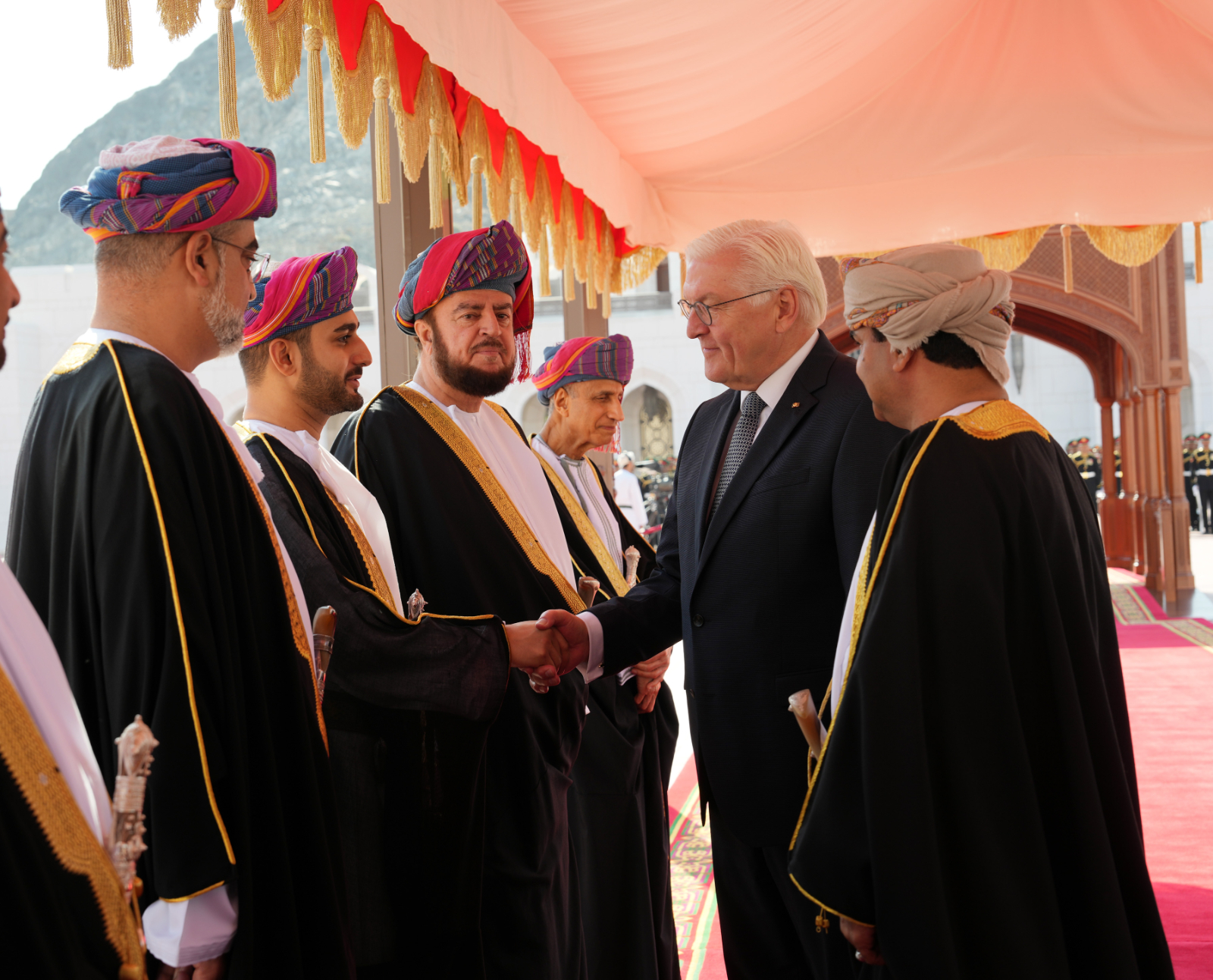 عقب ذلك صافح جلالةُ السُّلطان المعظم الوفد الرسمي المرافق لفخامة الرئيس الدكتور/ فرانك فالتر شتاينماير رئيـس جمهورية ألمانيا الاتحادية مرحِّبًا بهم ومتمنّيًا لهم إقامة طيبة.