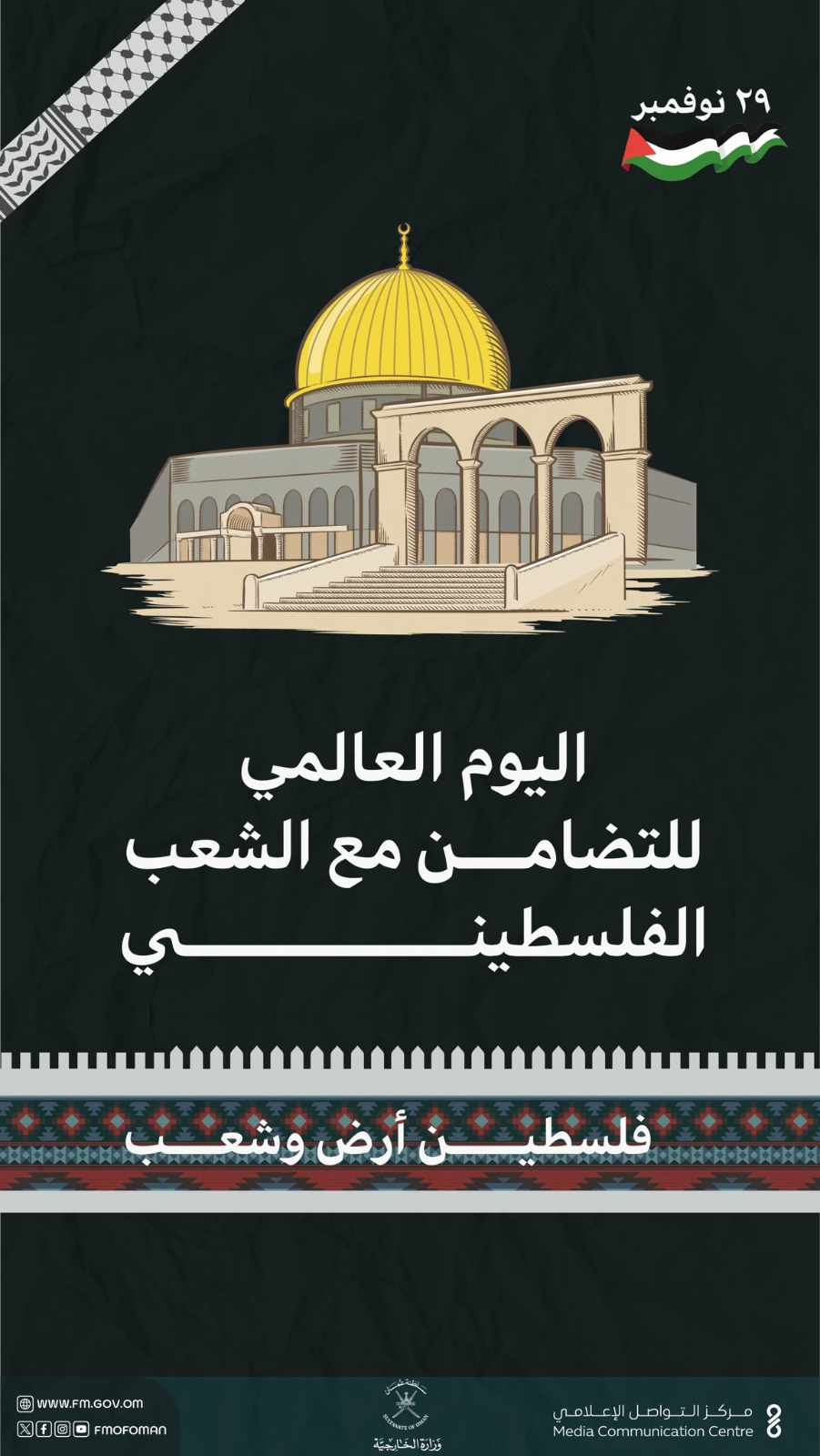 أكدت سلطنة عُمان على دعمها الراسخ لعدالة القضية الفلسطينية، وذلك بمناسبة اليوم العالمي للتضامن مع الشعب الفلسطيني الذي يصادف 29 نوفمبر من كل عام.