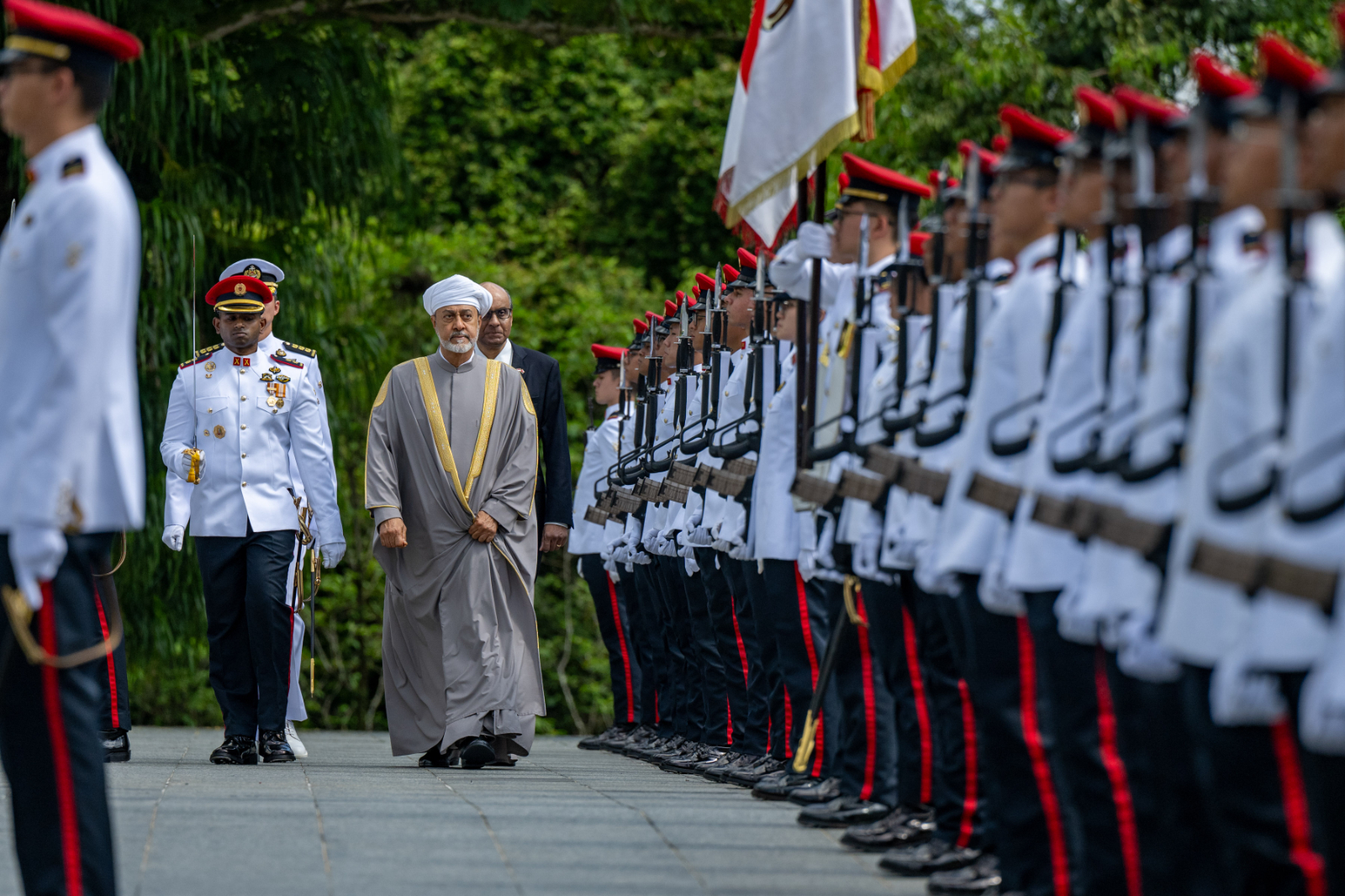 عقب ذلك اصطحب فخامةُ الرئيس جلالةَ السُّلطان المعظم إلى منصةِ الشّرف، حيث عُزف السّلام السُّلطانيُّ العُمانيُّ والسّلام الجمهوريُّ السنغافوريُّ، بعدها قام جلالةُ السُّلطان المعظم يرافقه فخامةُ الرئيس السنغافوري بتفقّد حرس الشّرف الذي أدّى التّحيّة لجلالتِه.