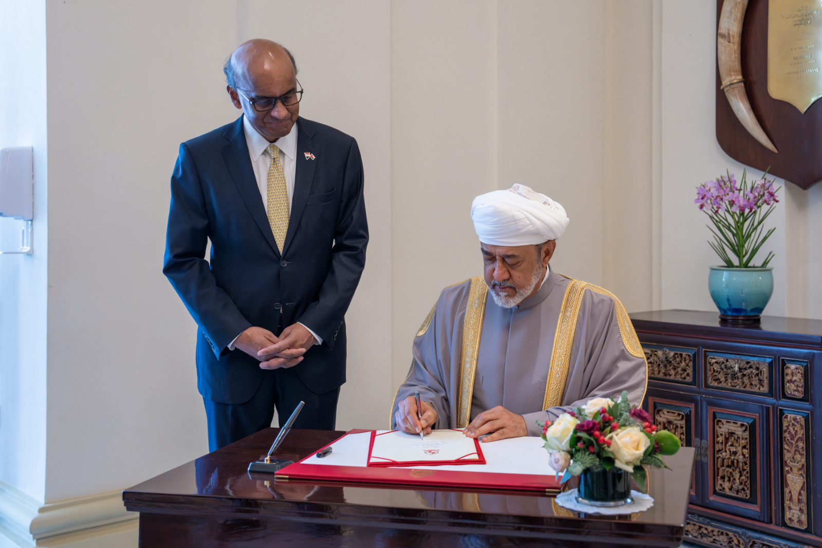 ثم توجّه القائدان إلى مبنى الاستقبال، حيث تفضّل جلالةُ سُلطان البلاد المفدّى بالتوقيع في سجل الزوار بعد ذلك صافح جلالةُ السُّلطان المعظم كبار مستقبليه من الجانب السنغافوري وهم: –