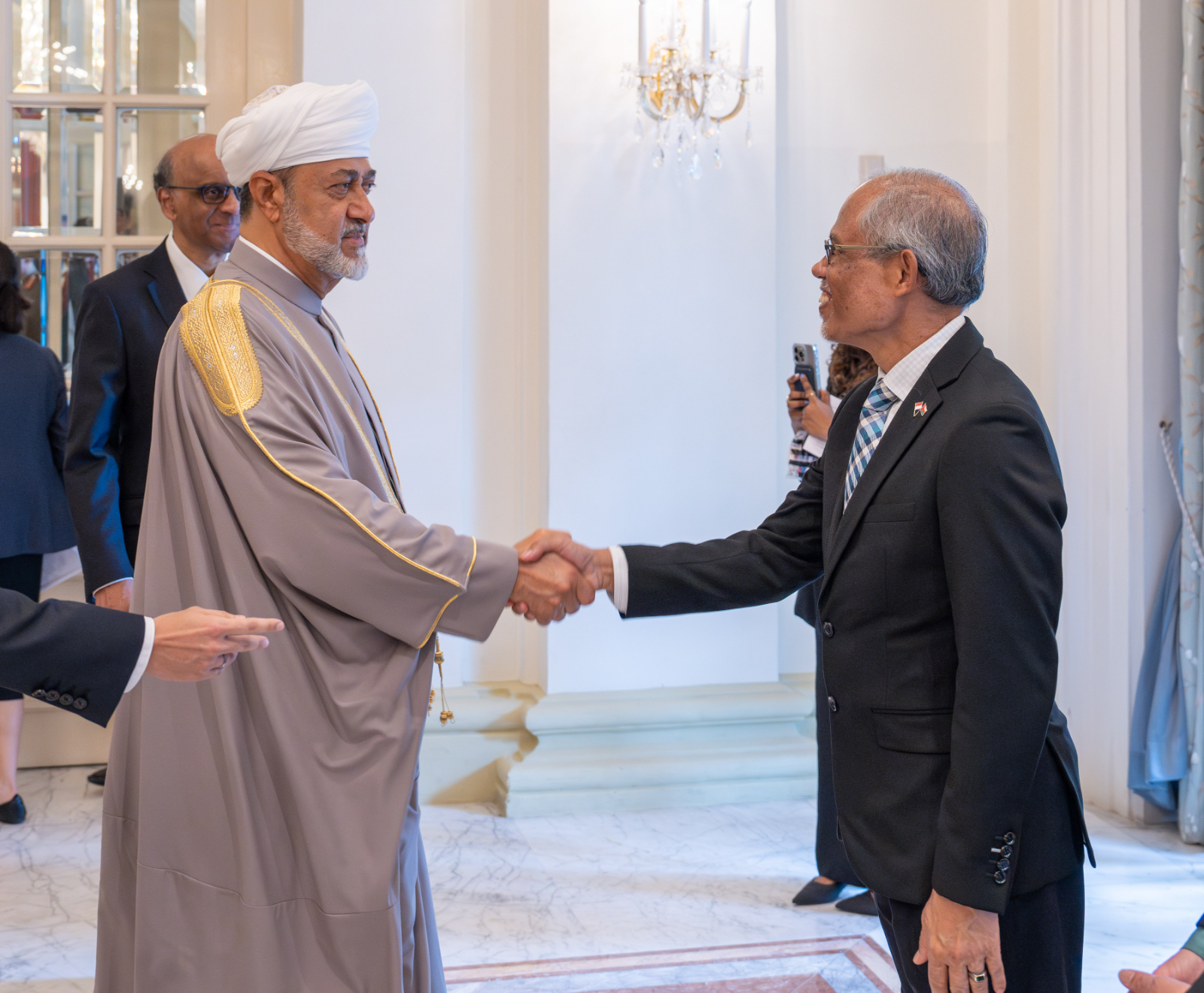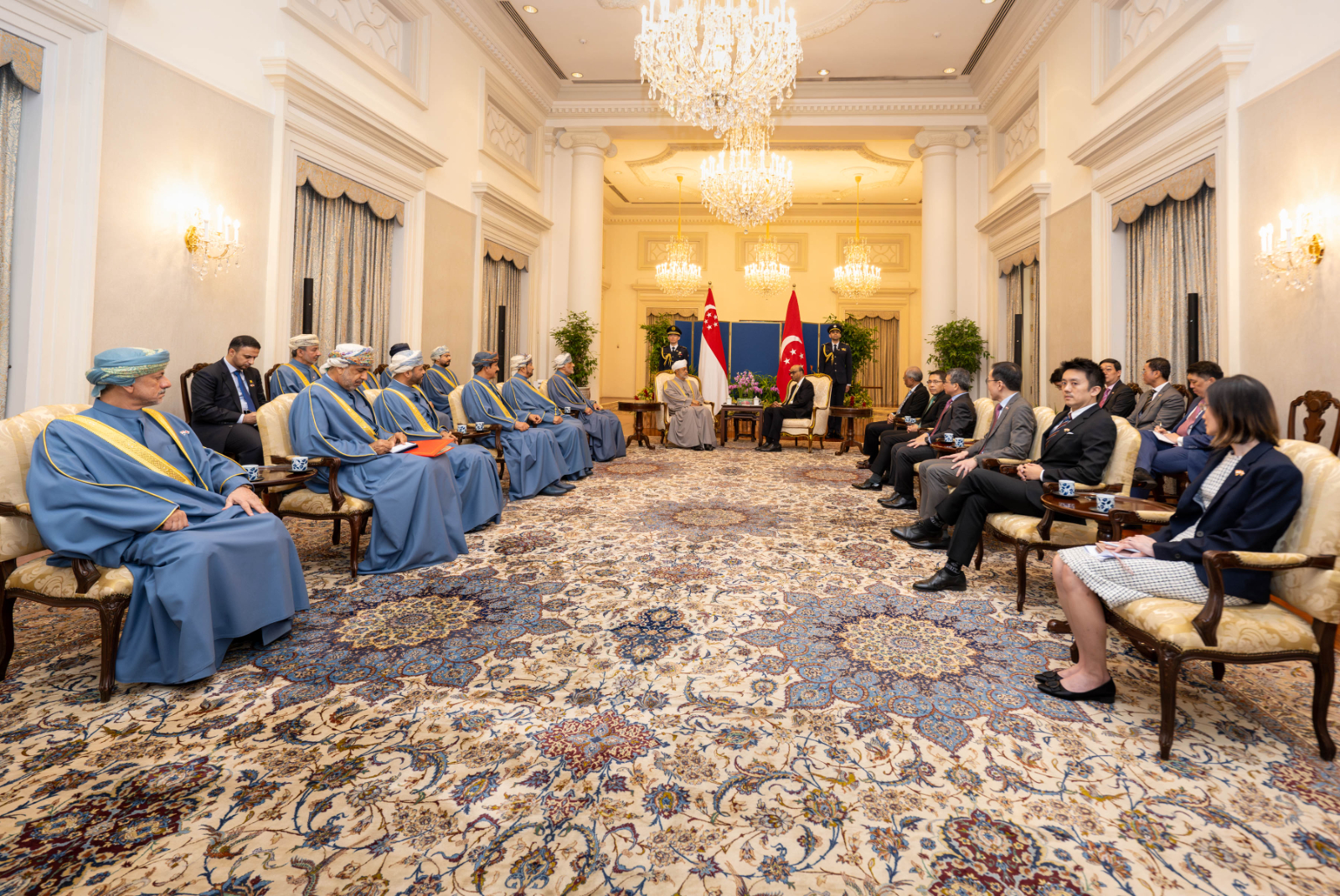 بعدها عقد حضرةُ صاحبِ الجلالةِ السُّلطان هيثم بن طارق المعظم /حفظهُ اللهُ ورعاهُ/ لقاءً ثُنائيًّا مع فخامة الرئيس ثارمان شانموغاراتنام رئيس جمهورية سنغافورة بقصر إستانا.