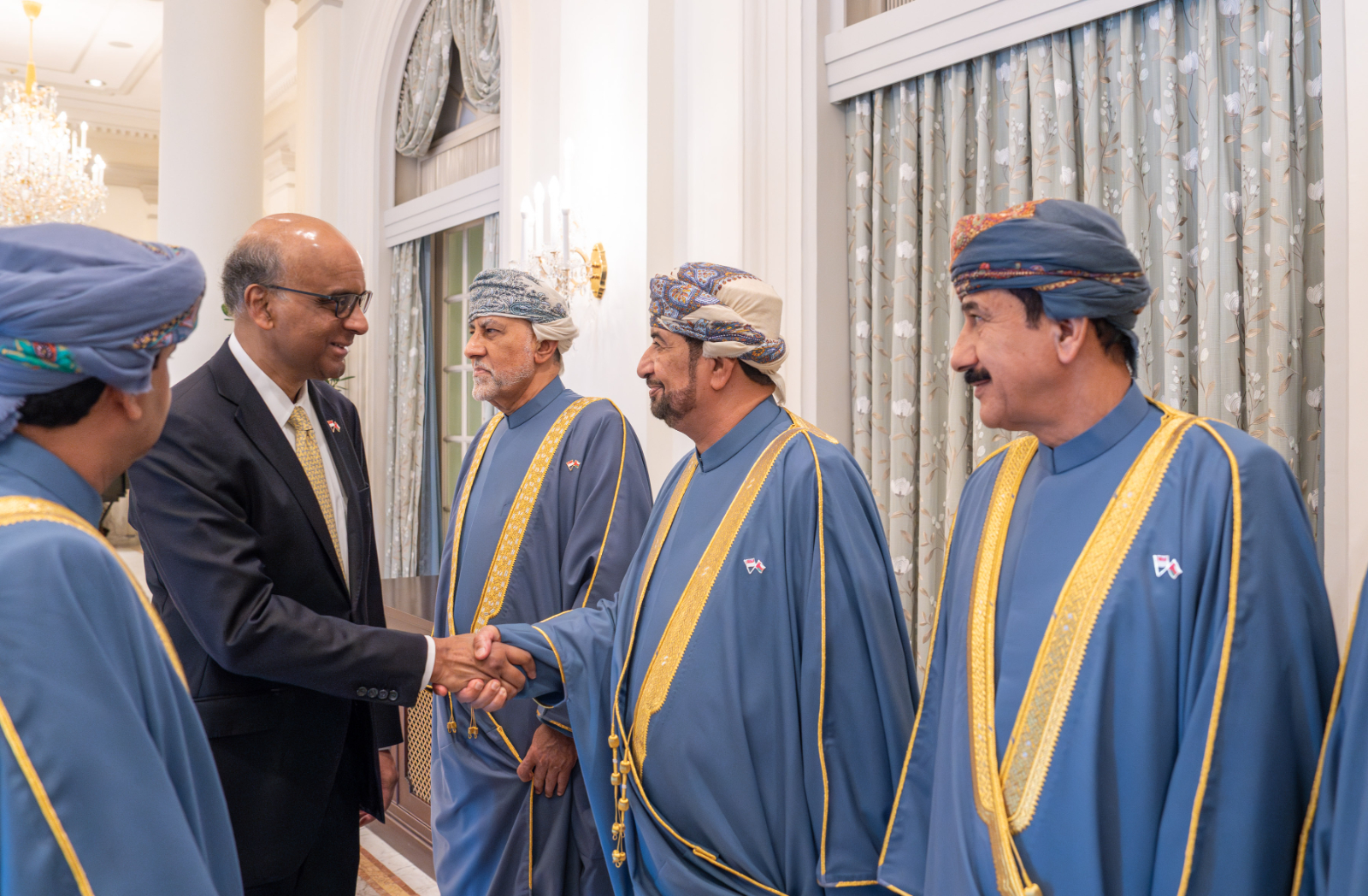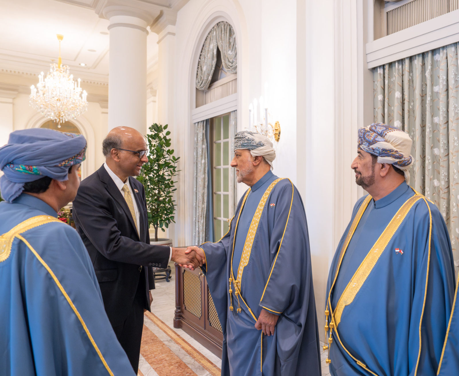 فلدى وصول الموكب المقلّ لجلالتِه إلى القصر الرئاسي كان فخامةُ الرئيس ثارمان شانموغاراتنام رئيسُ جمهورية سنغافورة في مُقدّمة المُستقبلين والمُرحّبين بجلالةِ السُّلطان المعظم، متمنّيًا لجلالتِه ولوفده المرافق طِيبَ الإقامة.