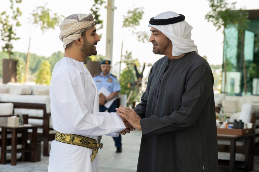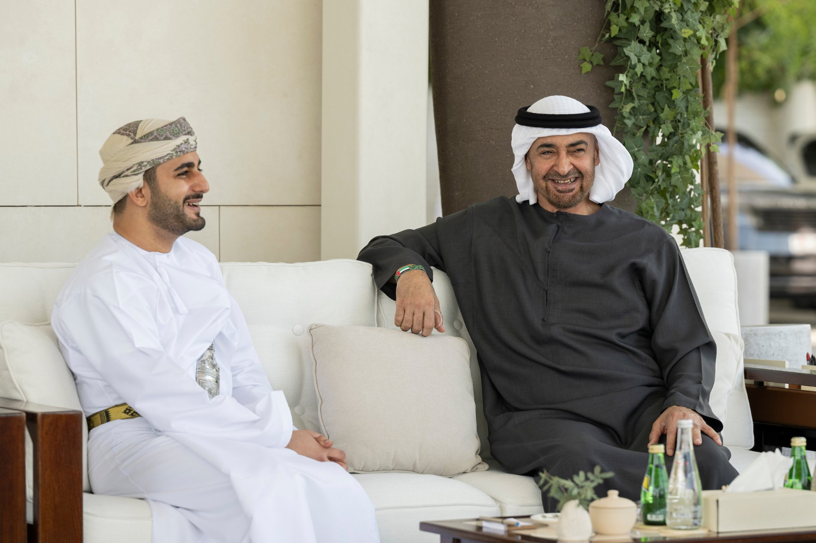 His Highness Sheikh Mohammed bin Zayed Al Nahyan, President of the United Arab Emirates, received His Highness Sayyid Theyazin bin Haitham Al Said at Al Shati Palace in Abu Dhabi this evening.