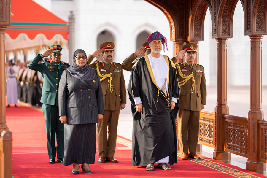 Along with His Majesty the Sultan, the Tanzanian President was received by His Highness Sayyid Shihab bin Tarik Al Said, Deputy Prime Minister for Defence Affairs; Sayyid Khalid bin Hilal Al Busaidi, Minister of the Diwan of Royal Court; General Sultan bin Mohammed Al Nu’mani, Minister of the Royal Office; Sayyid Hamoud bin Faisal Al Busaidi, Minister of the Interior; Sayyid Badr bin Hamad Al Busaidi, Foreign Minister; Dr Rahma bint Ibrahim Al Mahrouqi; Minister of Higher Education, Research and Innovation (Head of the Mission of Honour); Saud bin Hilal Al Shidhani, Ambassador of the Sultanate of Oman to the United Republic of Tanzania; Abdallah Abasi Kilima, Ambassador of the United Republic of Tanzania to the Sultanate of Oman and members of the Mission of Honour.