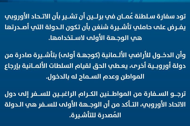 The Embassy of the Sultanate of Oman in Germany has issued an alert to Omani visitors to the European Union.